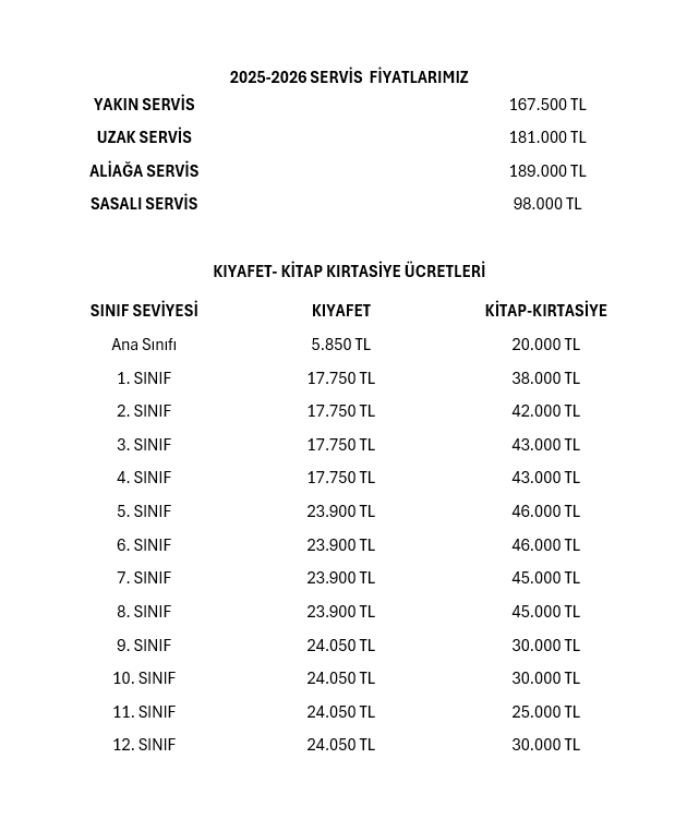 Aşağıdaki ücretlere %10 KDV (DAHİL) ek olup ; KDV oranında değişiklik olması ihtimalinede , KDV oranlarında yasal olarak yapılacak değişiklikler velilerimize yansıtılacaktır.
